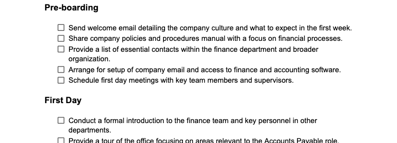 This checklist outlines the onboarding process for a new employee in the Accounts Payable department. It covers the pre-boarding phase, the first day, the end of the first week, and the end of the first three months. Activities include sharing essential information, introducing the employee to the team and company processes, providing training, and gradually increasing task complexity. Regular check-ins and feedback sessions ensure the employee's smooth integration into the role and the company. The process concludes with a formal review to finalize onboarding.