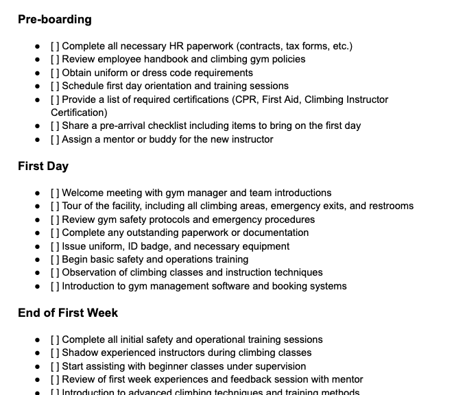 This checklist outlines the onboarding process for climbing instructors. The pre-boarding phase includes completing HR paperwork, reviewing the employee handbook and gym policies, and obtaining required certifications. On the first day, new instructors will meet with the gym manager and team, tour the facility, review safety protocols, and receive their uniform and equipment. The end of the first week includes completing safety and operational training, shadowing experienced instructors, and assisting with beginner classes. The end of the first three months focuses on developing proficiency in teaching beginner to intermediate climbing classes, completing additional certifications, participating in emergency drills, and giving a class observed by a manager.