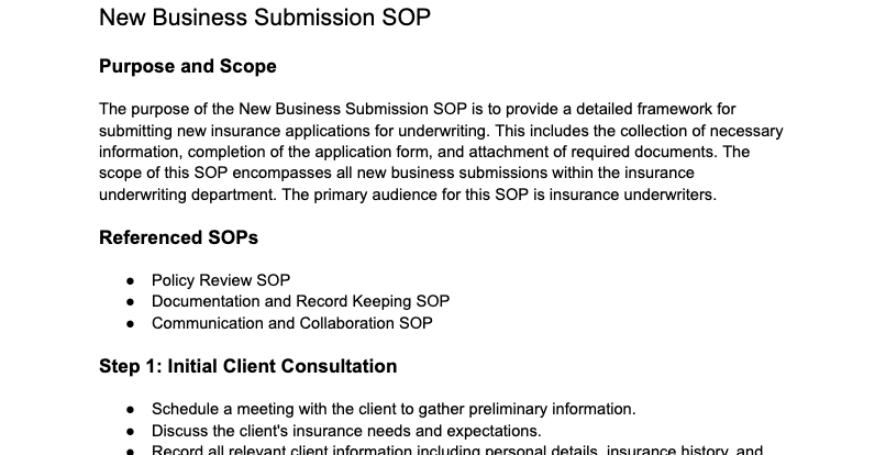 This document describes the Standard Operating Procedures (SOPs) for insurance underwriting. It covers New Business Submission, Risk Assessment, Policy Review, Renewal Underwriting, Claims Evaluation, Underwriting Audit, Underwriting Guidelines, Documentation and Record Keeping, Communication and Collaboration, Continuous Professional Development, and Policy Endorsement. Each SOP outlines the purpose and scope, referenced SOPs, and step-by-step procedures to ensure that all underwriting activities are performed consistently, accurately, and in compliance with internal and external regulations. The SOPs emphasize risk assessment, documentation, communication, and adherence to underwriting guidelines.
