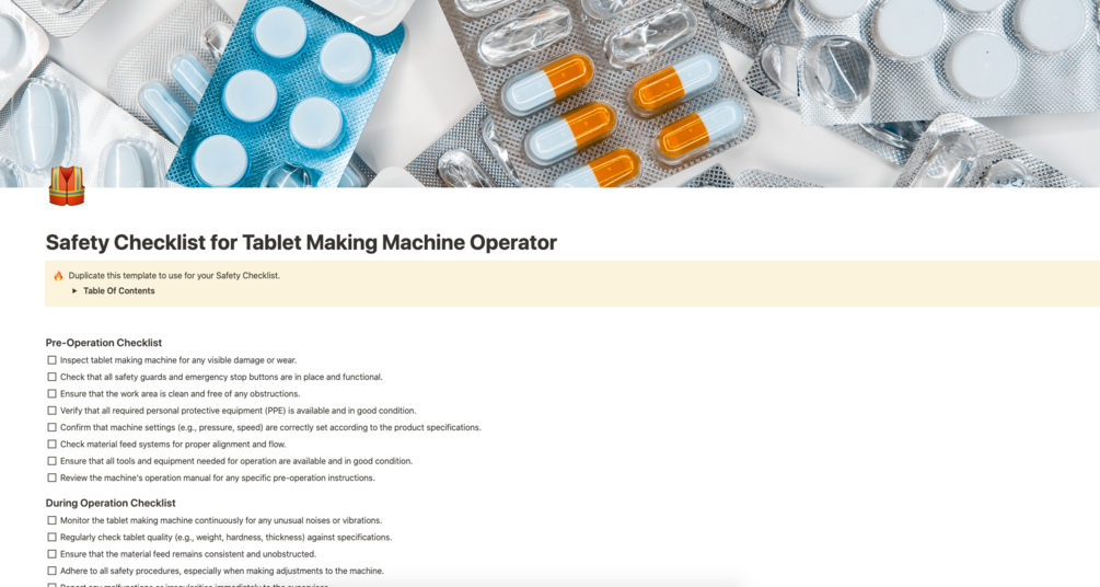 Use this checklist template as your Safety Checklist for Tablet Making Machine Operator.