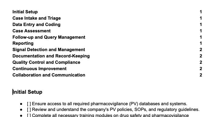 This checklist provides a high-level overview of the pharmacovigilance process. The main activities include: case intake and triage, data entry and coding, case assessment, follow-up and query management, reporting, signal detection and management, documentation and record-keeping, quality control and compliance, continuous improvement, and collaboration and communication.
