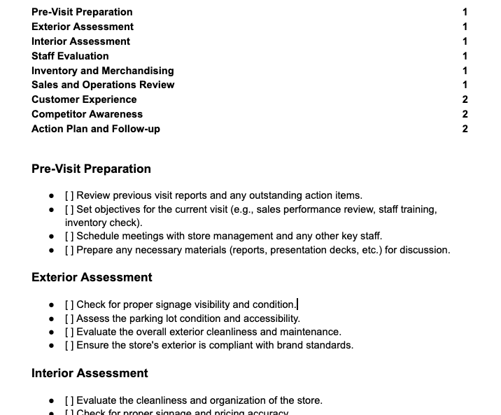 This checklist outlines the key areas to assess during a store visit, from pre-visit preparation to action planning and follow-up. The areas include: exterior assessment, interior assessment, staff evaluation, inventory and merchandising, sales and operations review, customer experience, and competitor awareness. By completing this checklist, store managers can ensure that their stores are running smoothly and efficiently, and that they are providing customers with the best possible shopping experience.